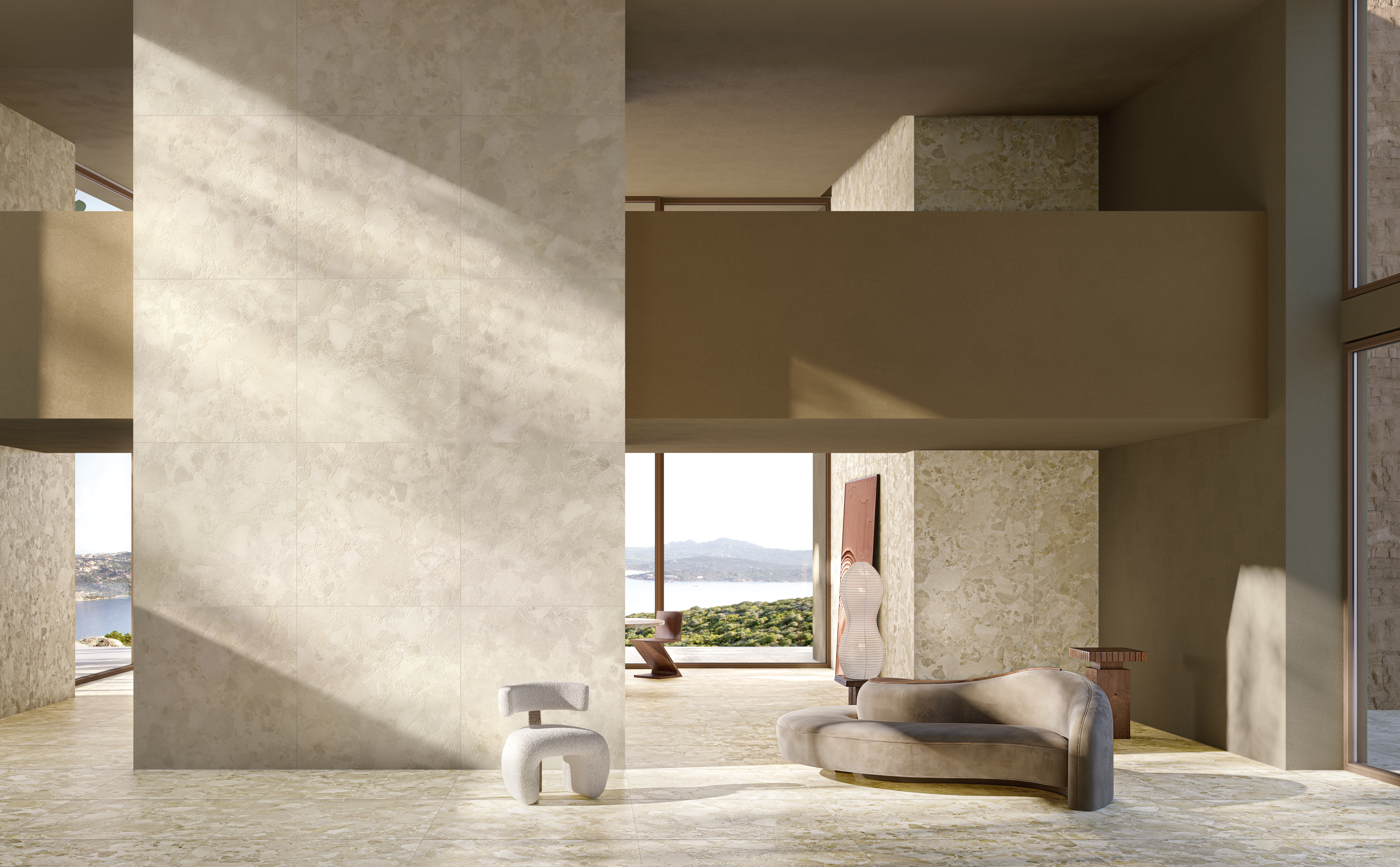 Developed using advanced 3D surface technology, the result is a surface that feels dynamic yet considered, with subtle highlights and shadows that enhance its character throughout the day, offering a versatile foundation for contemporary interiors.