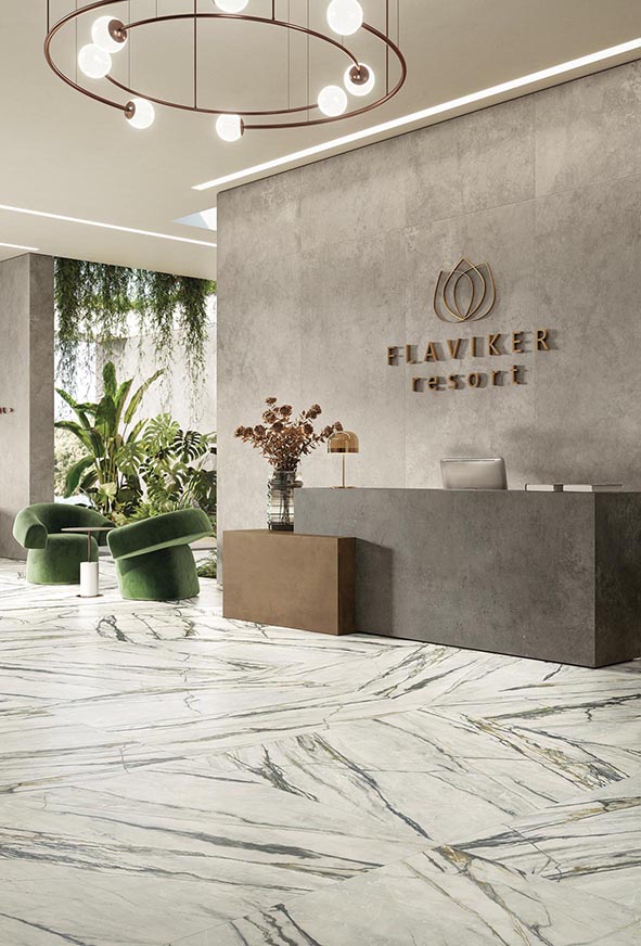 The Lucca collection comes in six version.  Emerald features numerous variations of green, Amber, a splendid quartz combining warm colour accents, Grey Lilac with a defined anthracite-coloured veins.  Gold is a striking combination of dark and rich gold veining, Rose is a dusty white surface mingled by pink gold veins and Sapphire is a stand out elegantly veined white surface interspersed with blue hues.